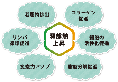 人体外部からもたらされた熱は肌に直接作用するため、肌の乾燥や静脈瘤発生の原因となり、血液及びリンパ循環は一時的に上昇した後、再び低下します。しかし、深部熱を利用した高周波の温熱は生体熱エネルギーを利用しているため、人体の内・外部効果的であり、組織の機能向上と自然治療を促し、血液とリンパ循環を向上させる、より優れた温熱と言えるでしょう。